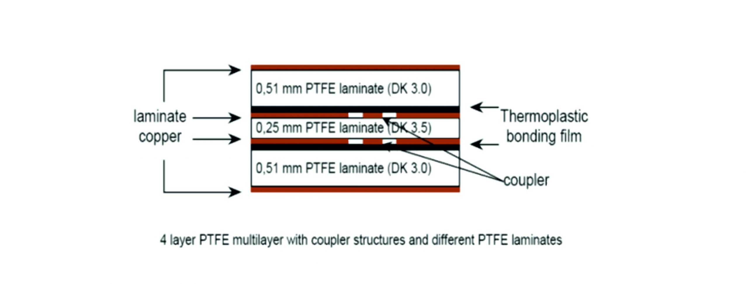 Multilayers made of PTFE have been virtually unknown until recent time, but total system cost analyses have changed the rules: Multilayers made entirely from thermoplastic materials are being used as well as hybrid multilayers composed of PTFE and FR4. In all-RF multilayers thermoplastic bonding films made of CTFE (for instance TacBond HT1.5 bonding film from TACONIC) or FEP are used to bond the inner layers instead of prepregs. As with FR4 multilayers, increasing packaging densities of printed circuit boards are the decisive factors. It is also possible to obtain coupler structures, whereby PTFE inner layers of different thicknesses and dielectric constants can be bonded together (pls. see a picture below).
